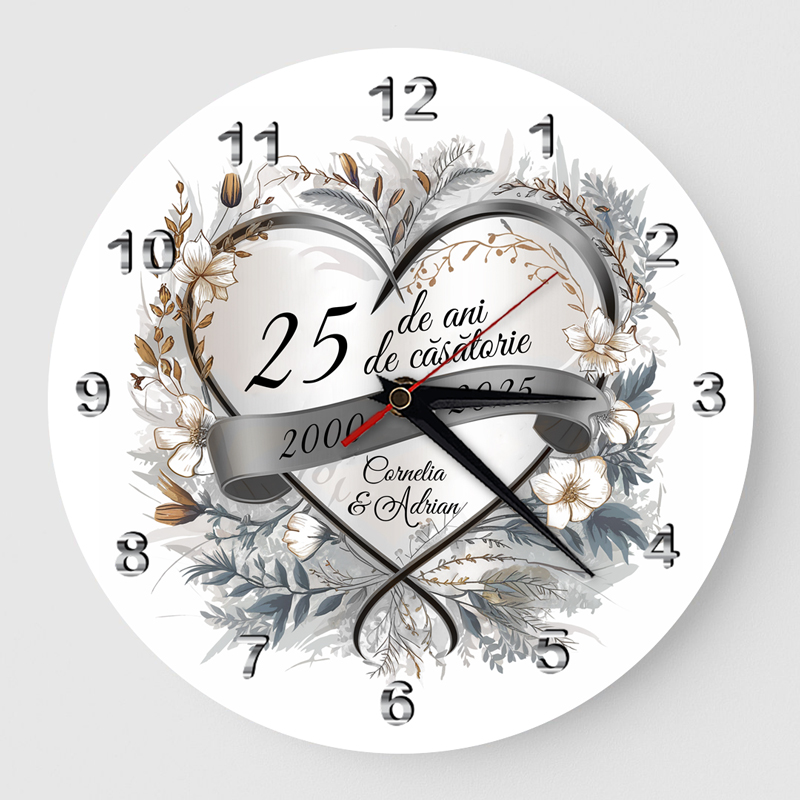 Celebrează o poveste de dragoste care durează de un sfert de secol cu un ceas de perete personalizat, creat special pentru aniversarea de 25 de ani de căsnicie. Elegant, plin de semnificație și realizat cu grijă, acest ceas este un cadou de suflet, perfect pentru un cuplu extraordinar.