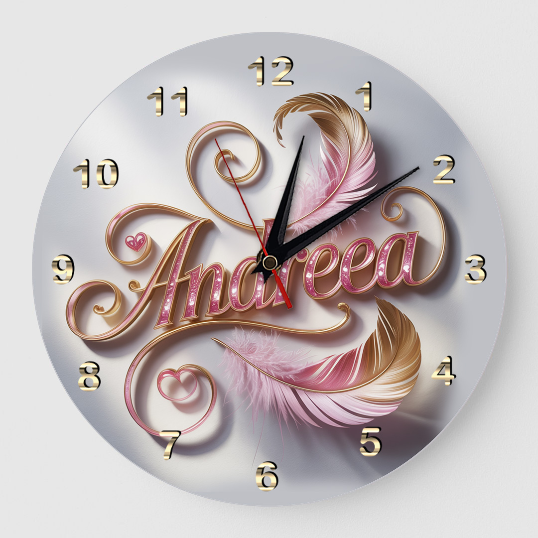 Transformă fiecare clipă într-un moment special cu acest Ceas cadou cu nume pene roz, un cadou delicat și elegant pentru fete sau femei dragi!