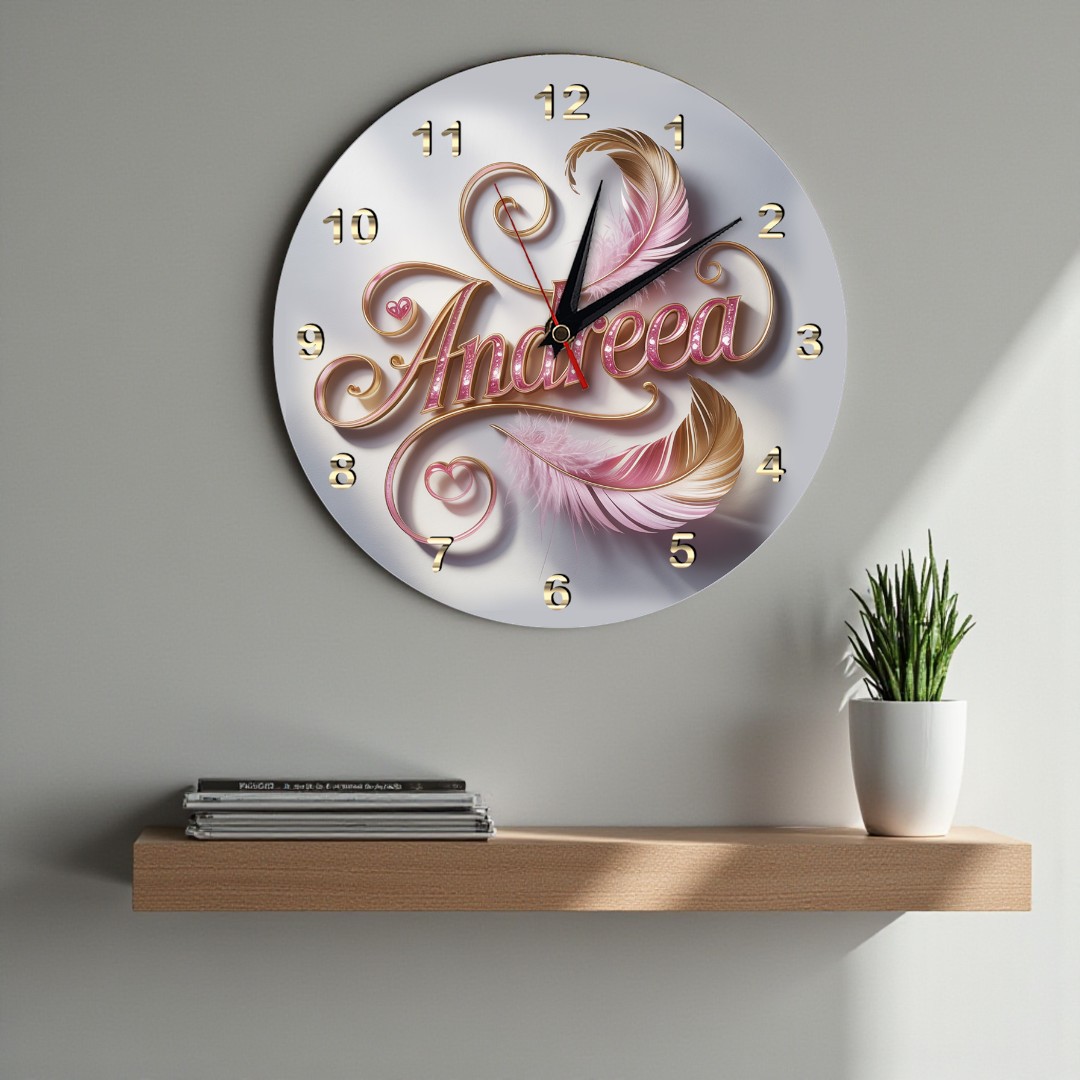 🕊️ Ceas cadou cu nume pene roz | Print UV + Mecanism Silențios 🙏