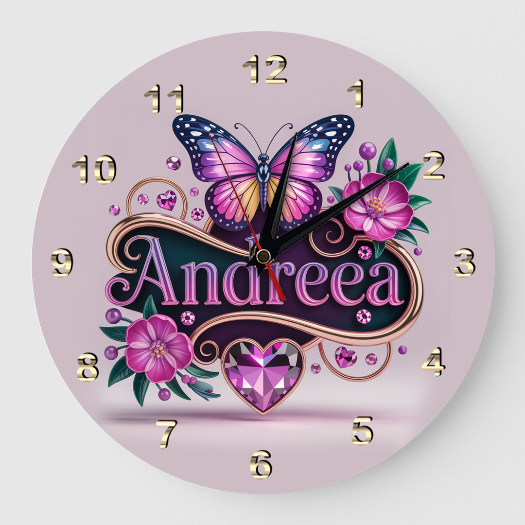 🕊️ Ceas cu Nume fluture mov si inima cristal | Print UV + Mecanism Silențios 🙏