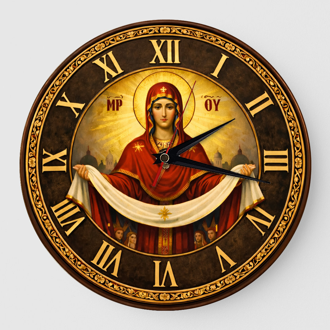 🕊️ Ceas de Perete Cadou Creștin – Acoperământul Maicii Domnului | Print UV + Mecanism Silențios 🙏