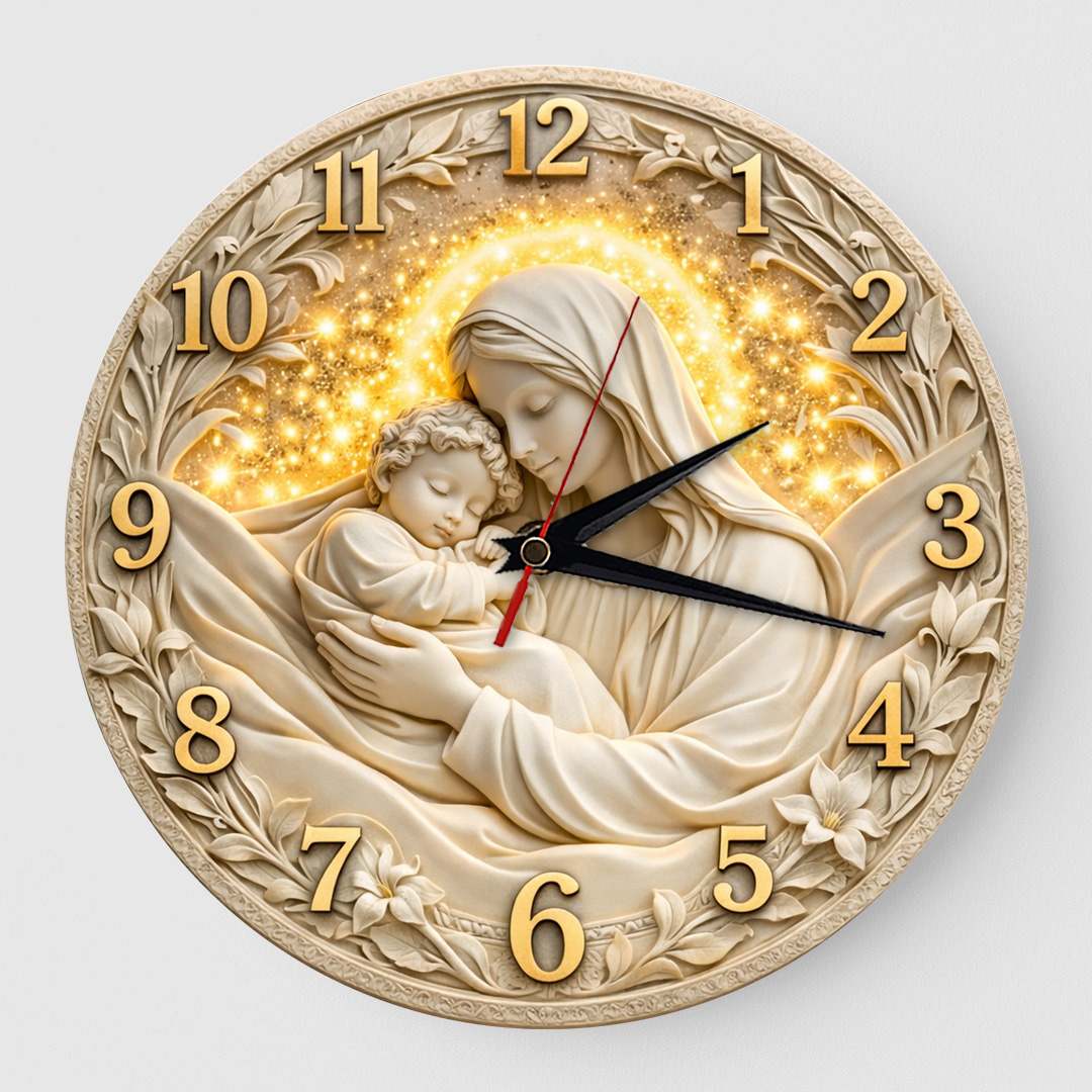 Simbol al credinței, al protecției și al iubirii materne, acest ceas nu este doar un obiect practic pentru măsurarea timpului, ci și o piesă decorativă care transmite un mesaj profund de ocrotire și armonie. Cifrele aurii sunt ușor de citit, iar aspectul artistic îl face potrivit pentru living, dormitor, hol sau pentru orice spațiu în care dorești să creezi o atmosferă liniștitoare.