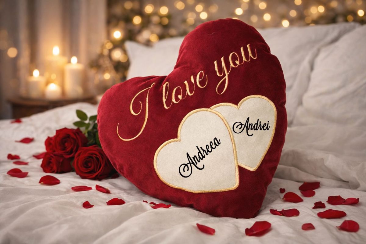 Pernă personalizată inimă brodată – cadoul romantic perfect